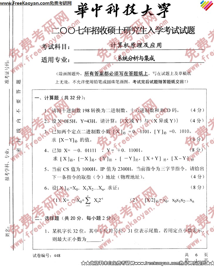 专业课考研经验 本站小编 FreeKaoyan 2018-01-23华中科技大学2007年考研真题-化学综合