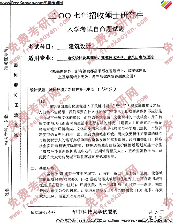 专业课考研经验 本站小编 FreeKaoyan 2018-01-23华中科技大学2007年考研真题-规划设计6小时快题