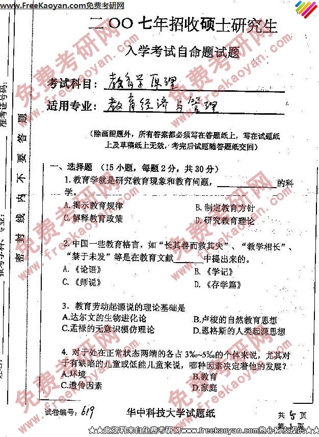 专业课考研经验 本站小编 FreeKaoyan 2018-01-23华中科技大学2007年考研真题-教育经济学