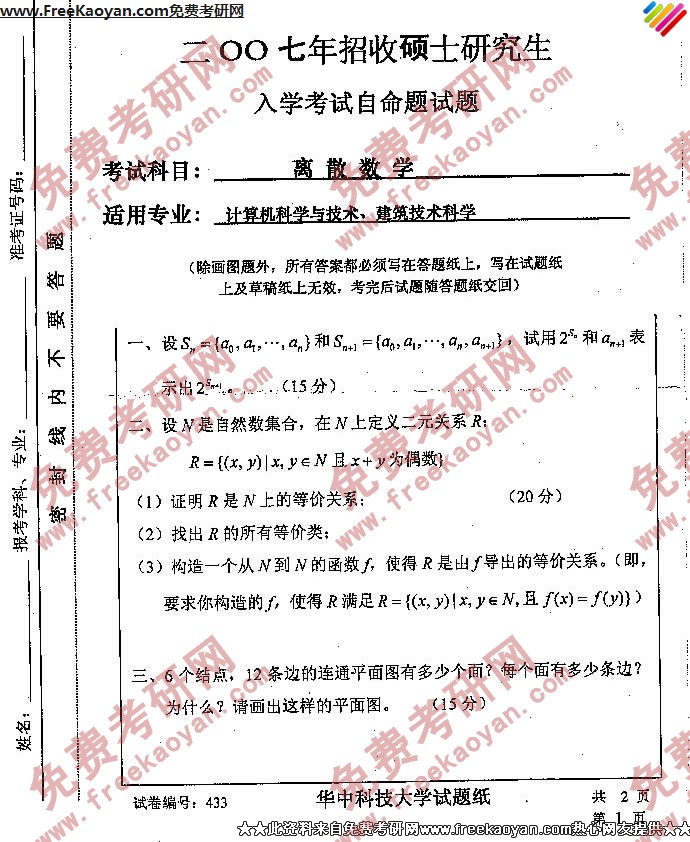 专业课考研经验 本站小编 FreeKaoyan 2018-01-23华中科技大学2007年考研真题-建筑设计