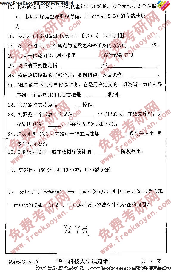 专业课考研经验 本站小编 FreeKaoyan 2018-01-23华中科技大学2007年考研真题-离散数学