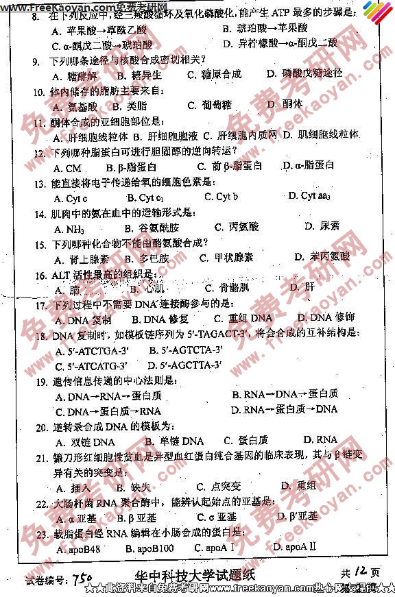 华中科技大学2007年考研真题-生物化学与分子生物学952