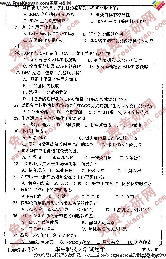华中科技大学2007年考研真题-生物化学与分子生物学952