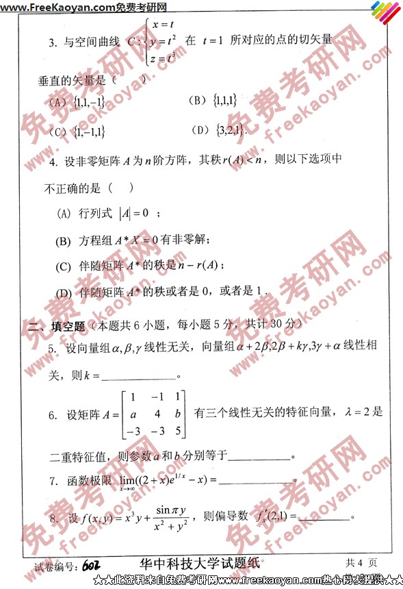 相关话题/考研真题 华中科技大学 数学 线性代数 高等数学