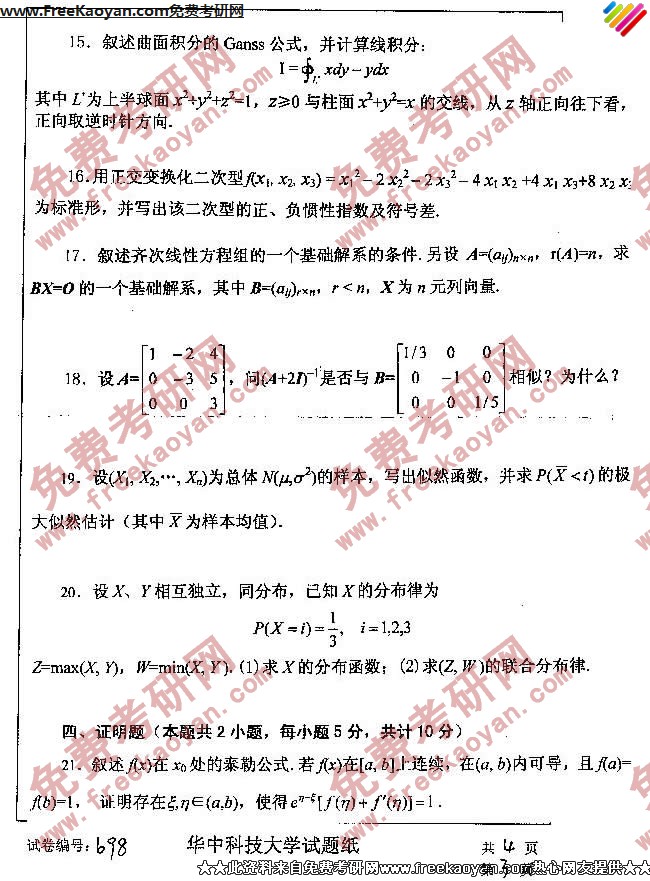 华中科技大学2007年考研真题-数学(含高等数学线性代数)