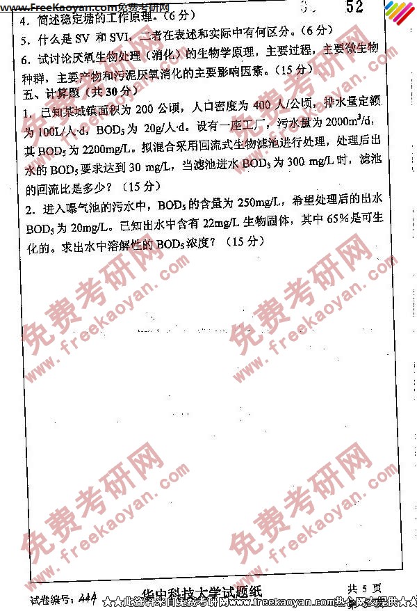 华中科技大学2007年考研真题-水污染控制工程(5)