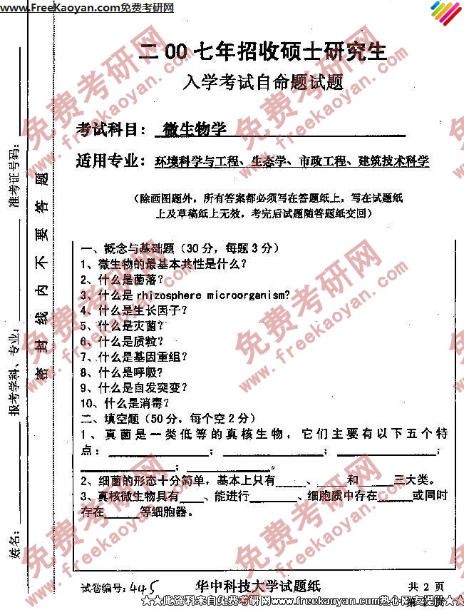 专业课考研经验 本站小编 FreeKaoyan 2018-01-23华中科技大学2007年考研真题-生物综合