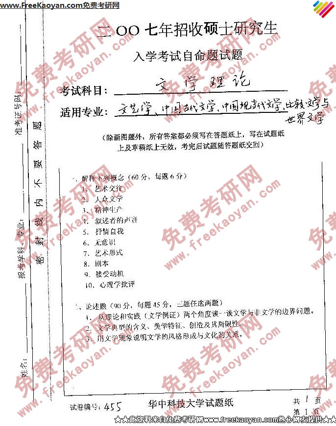 专业课考研经验 本站小编 FreeKaoyan 2018-01-23华中科技大学2007年考研真题-数学(文经类)(单考)