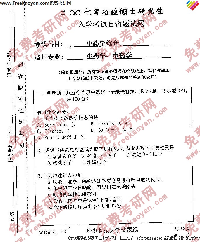 专业课考研经验 本站小编 FreeKaoyan 2018-01-23华中科技大学2007年考研真题-药学综合