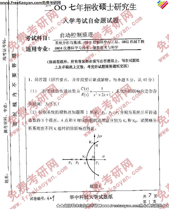 华中科技大学2007年考研真题-自动控制原理