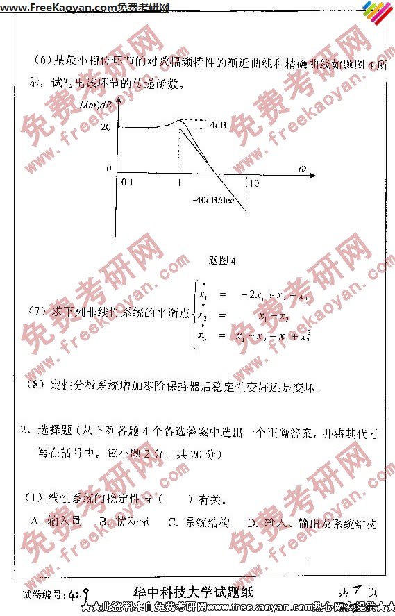 华中科技大学2007年考研真题-自动控制理论