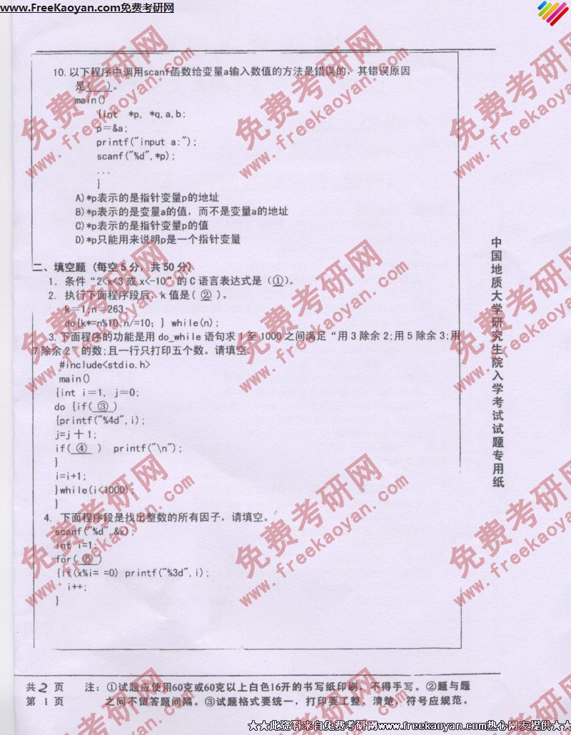 中国地质大学(武汉)2007年考研真题-C语言(2)