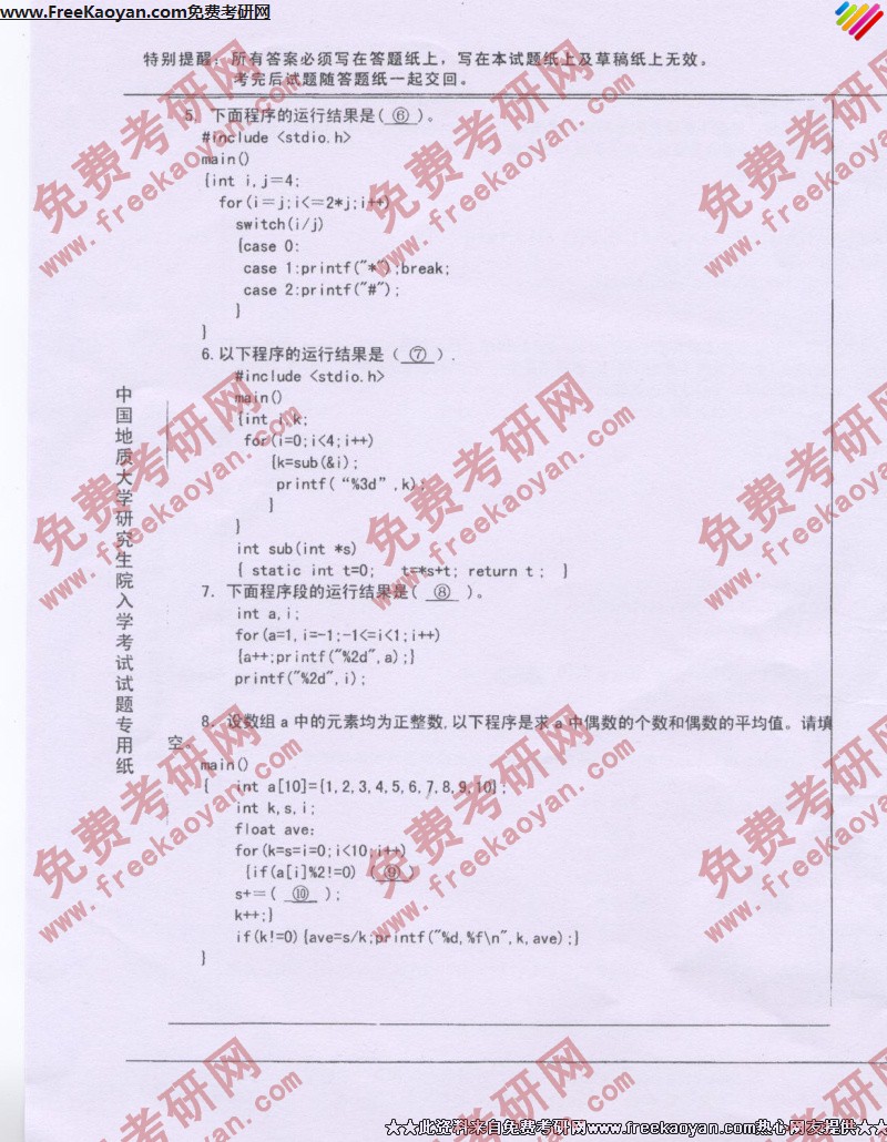 中国地质大学(武汉)2007年考研真题-C语言(3)