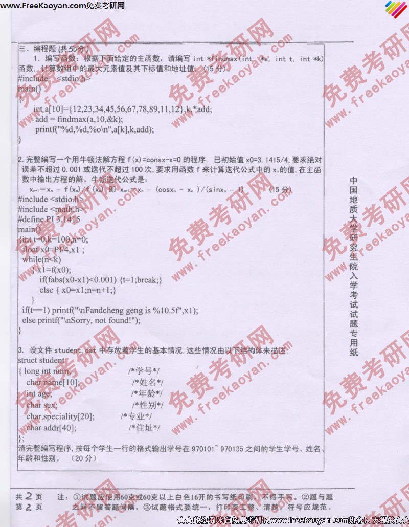 中国地质大学(武汉)2007年考研真题-C语言(4)