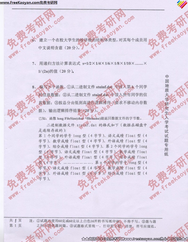 专业课考研经验 本站小编 FreeKaoyan 2018-01-23中国地质大学(武汉)2007年考研真题-C语言