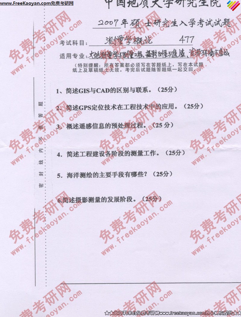 专业课考研经验 本站小编 FreeKaoyan 2018-01-23中国地质大学(武汉)2007年考研真题-测量平差