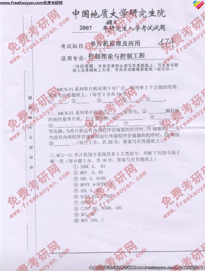 中国地质大学(武汉)2007年考研真题-单片机原理及应用