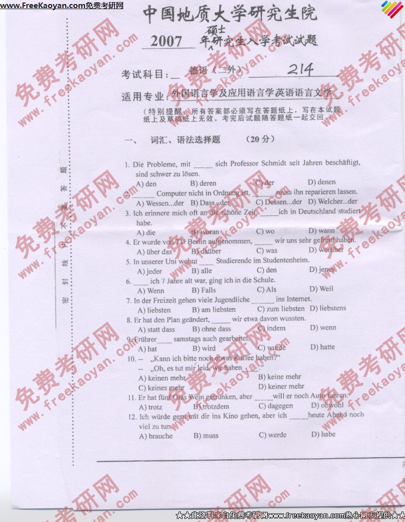中国地质大学(武汉)2007年考研真题-德语(二外)