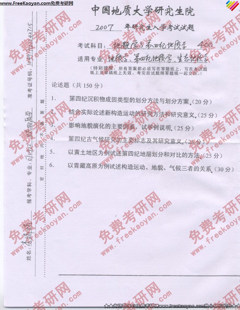 中国地质大学(武汉)2007年考研真题-地貌学与第四纪地质学