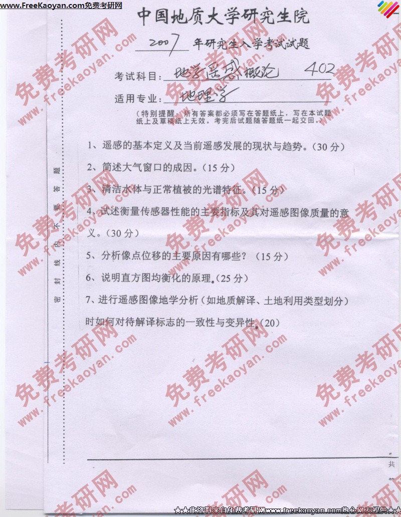 中国地质大学(武汉)2007年考研真题-地学遥感概论