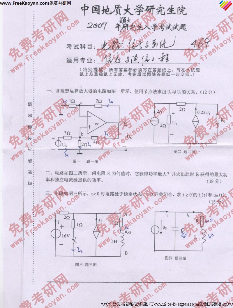 中国地质大学(武汉)2007年考研真题-电路、信号与系统