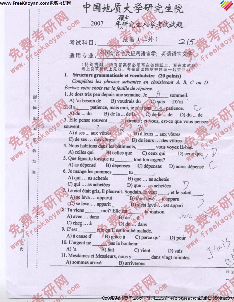中国地质大学(武汉)2007年考研真题-法语(二外)