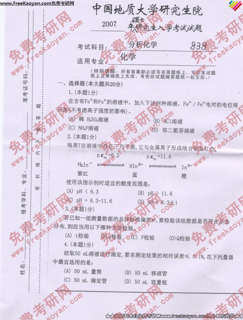 专业课考研经验 本站小编 FreeKaoyan 2018-01-23中国地质大学(武汉)2007年考研真题-地球化学
