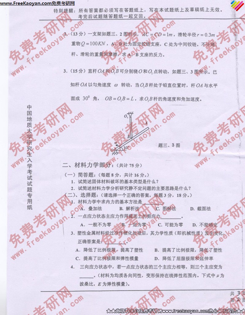 中国地质大学(武汉)2007年考研真题-工程力学(3)