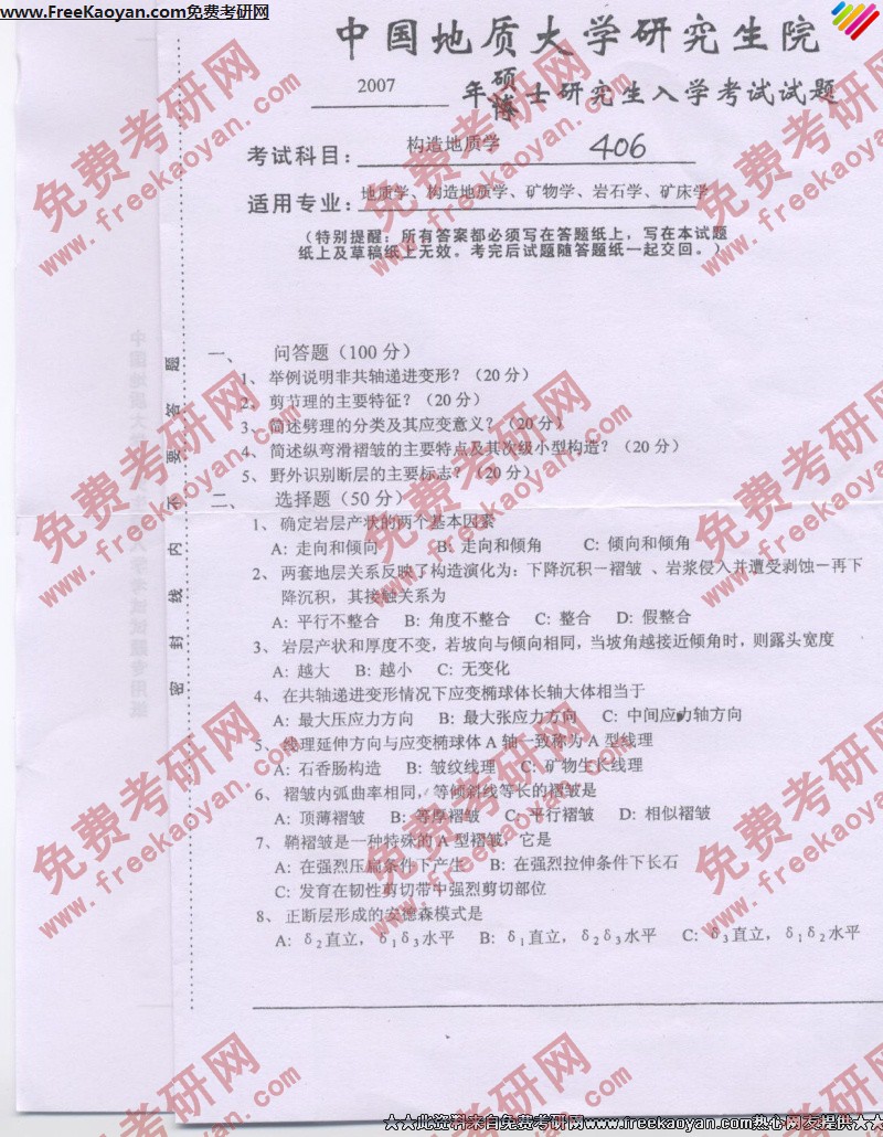 中国地质大学(武汉)2007年考研真题-构造地质学
