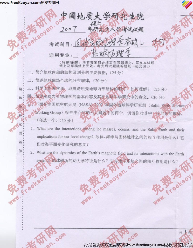 相关话题/中国地质大学 考研真题 基础 地球物理学 固体