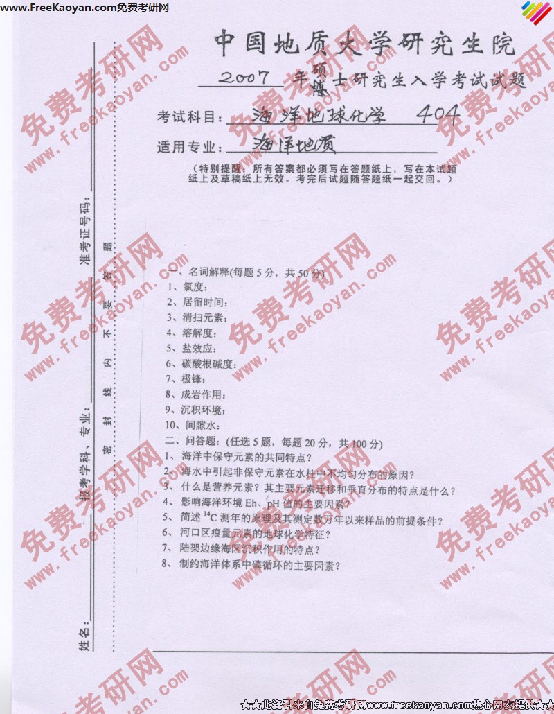 相关话题/考研真题 中国地质大学 地球化学 海洋