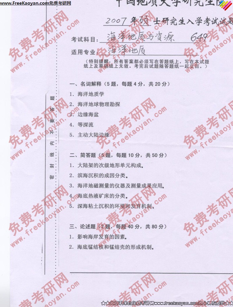 专业课考研经验 本站小编 FreeKaoyan 2018-01-23中国地质大学(武汉)2007年考研真题-海洋沉积学