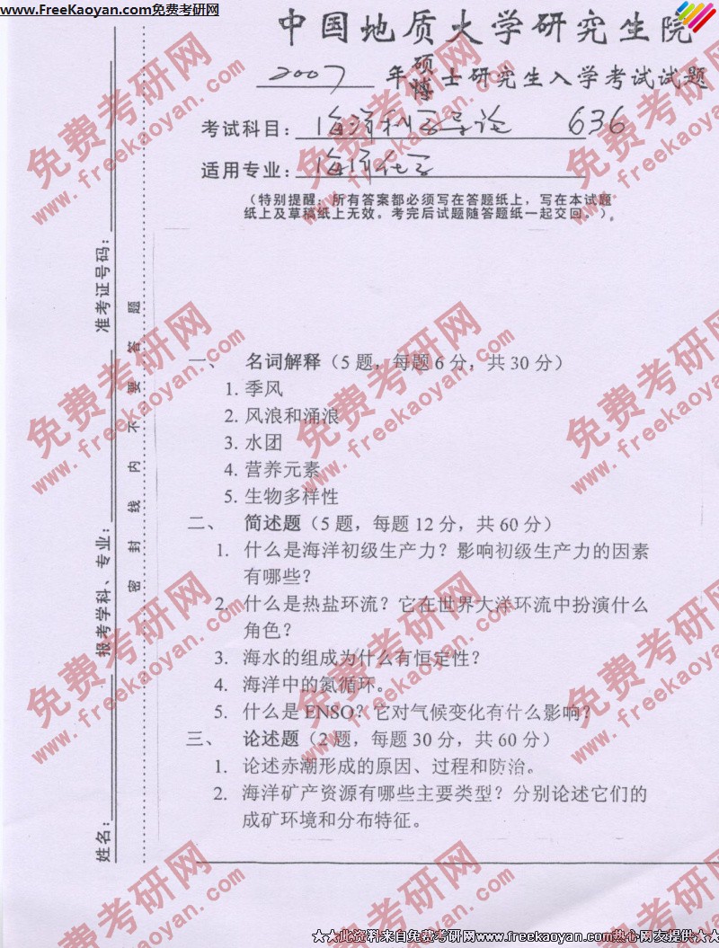 中国地质大学(武汉)2007年考研真题-海洋科学导论636