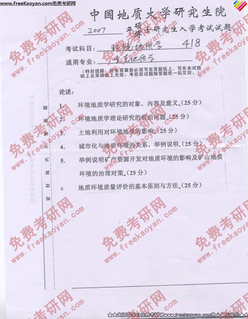 中国地质大学(武汉)2007年考研真题-环境地质学