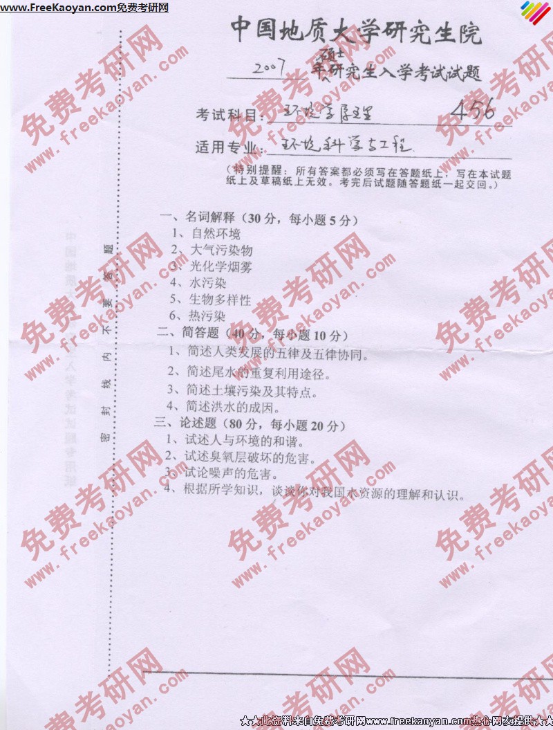 专业课考研经验 本站小编 FreeKaoyan 2018-01-23中国地质大学(武汉)2007年考研真题-环境评价与规划