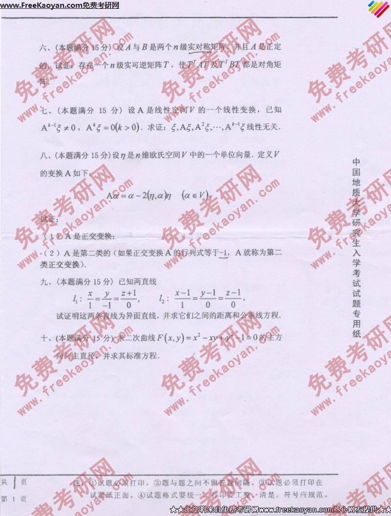 相关话题/考研真题 中国地质大学 高等代数 解析几何