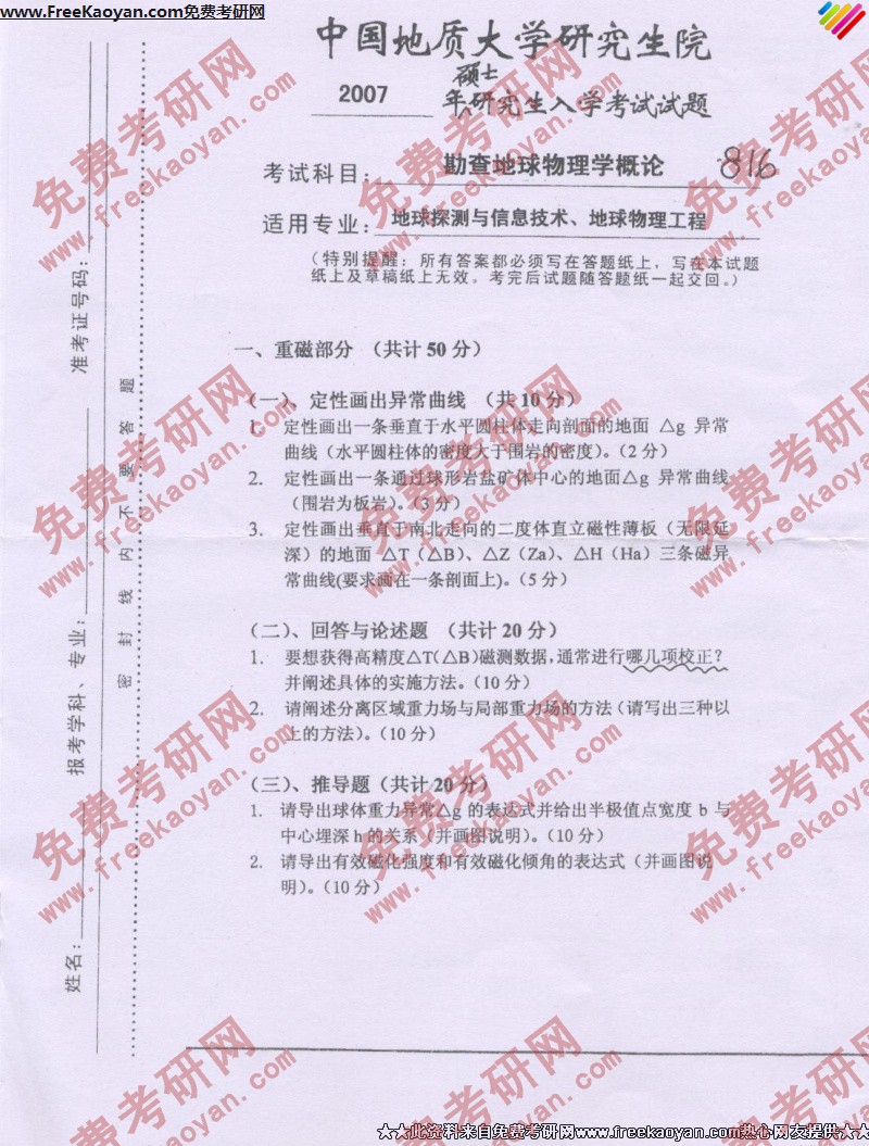 中国地质大学(武汉)2007年考研真题-勘查地球物理概论