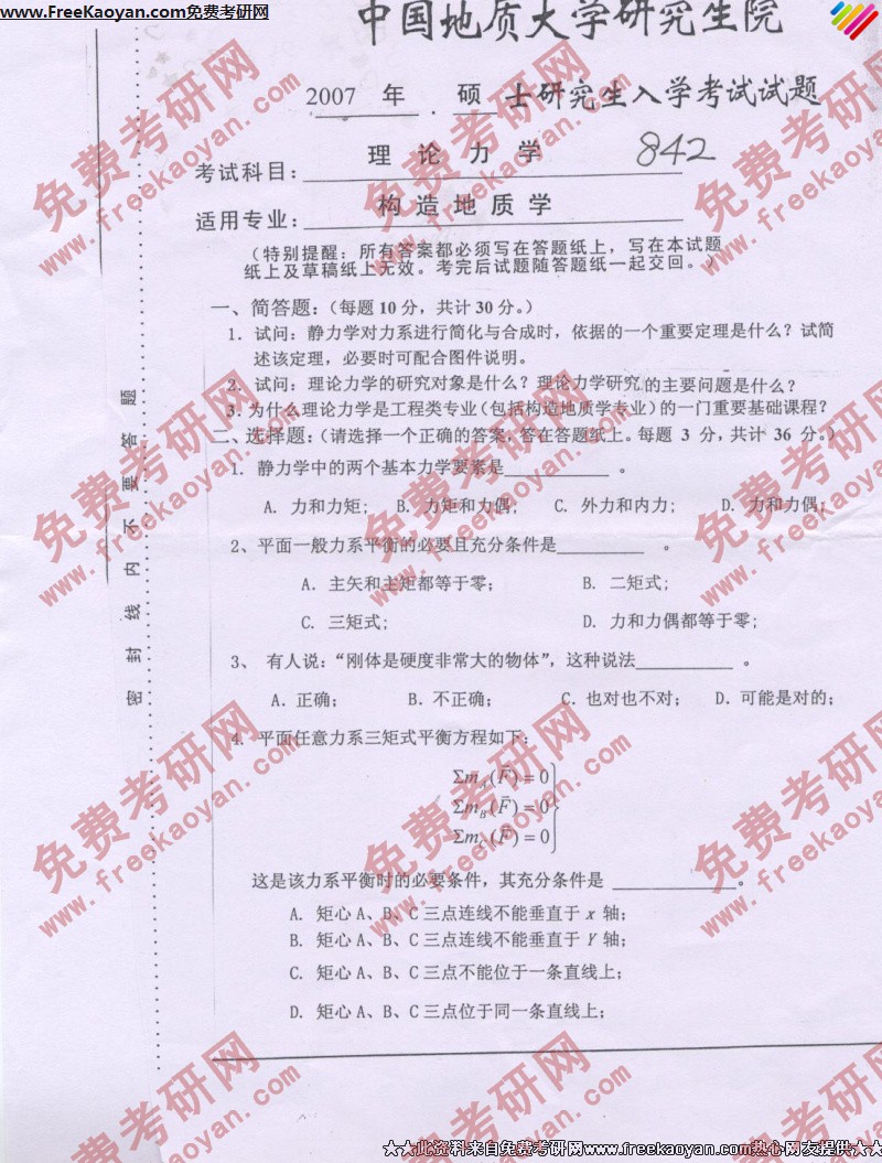 专业课考研经验 本站小编 FreeKaoyan 2018-01-23中国地质大学(武汉)2007年考研真题-结构力学