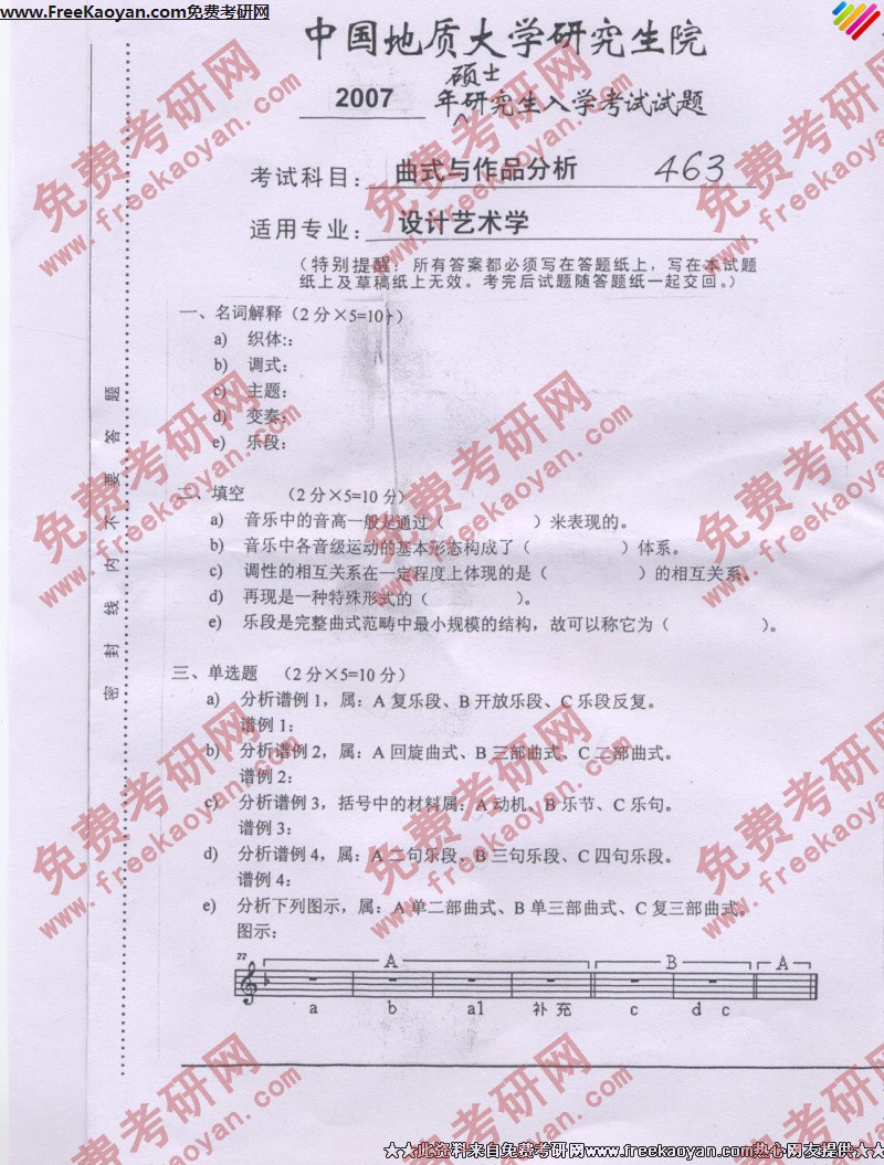 中国地质大学(武汉)2007年考研真题-曲式与作品分析