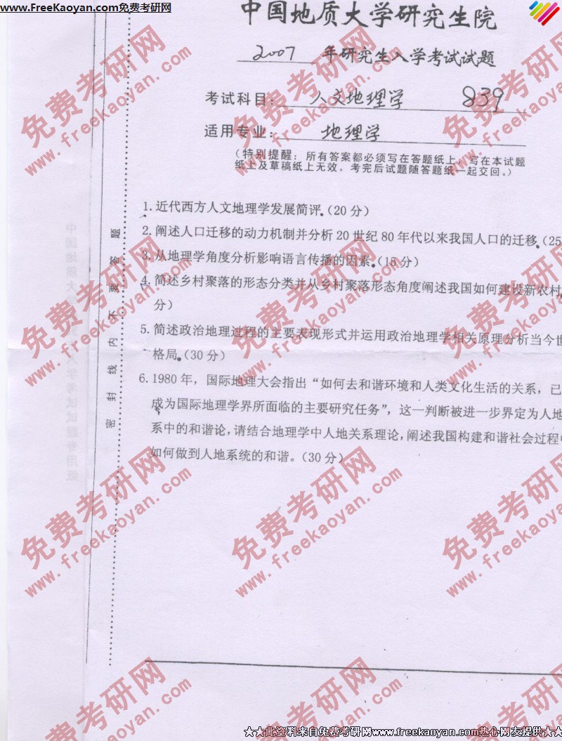 中国地质大学(武汉)2007年考研真题-人文地理学