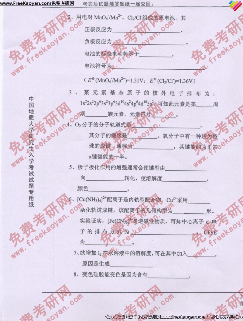相关话题/中国地质大学 考研真题 无机化学