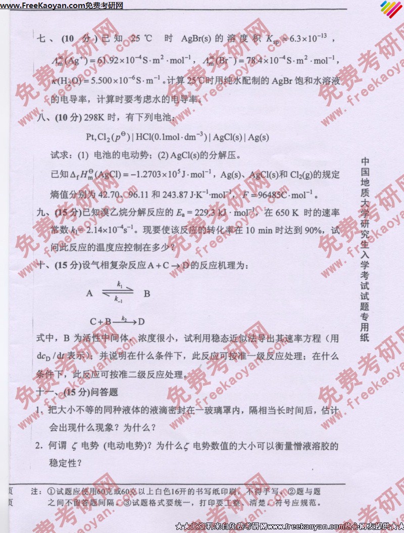 中国地质大学(武汉)2007年考研真题-物理化学(4)