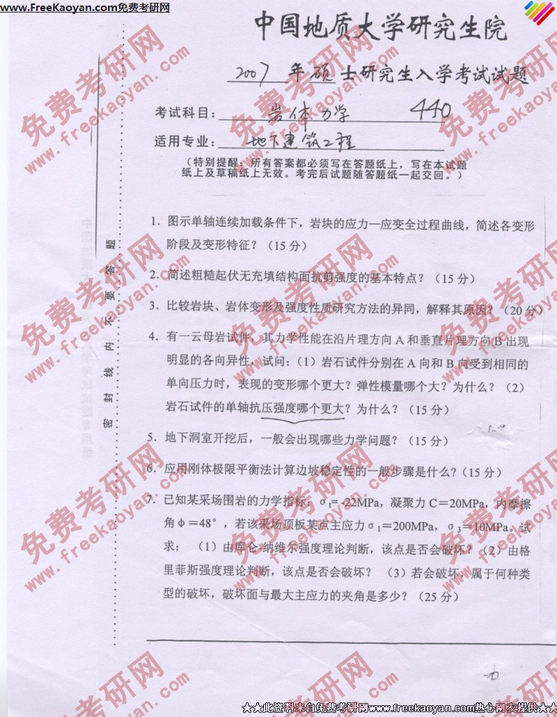 中国地质大学(武汉)2007年考研真题-岩体力学
