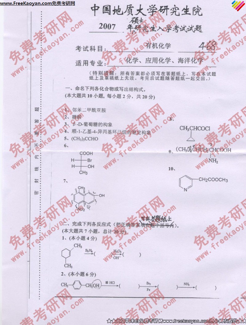 专业课考研经验 本站小编 FreeKaoyan 2018-01-23中国地质大学(武汉)2007年考研真题-无机化学
