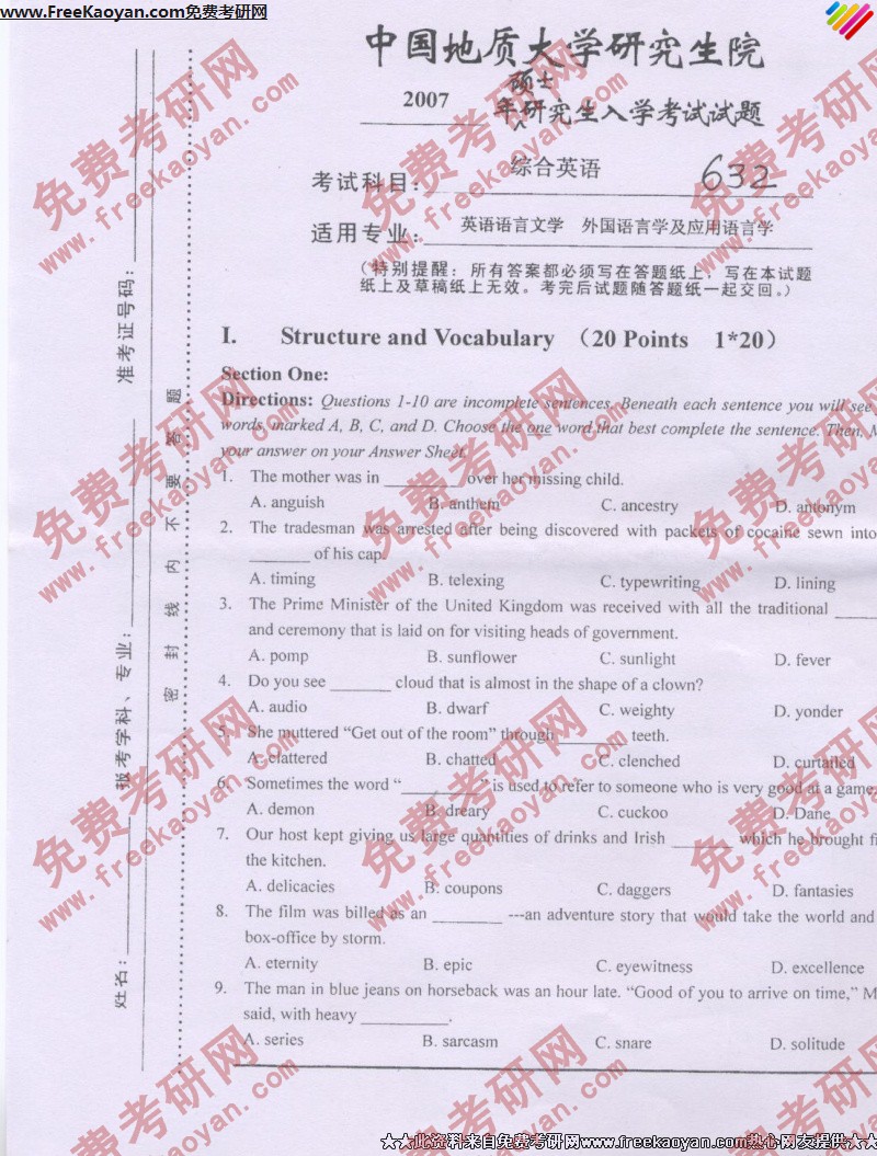 专业课考研经验 本站小编 FreeKaoyan 2018-01-23中国地质大学(武汉)2007年考研真题-英语语言文学基础
