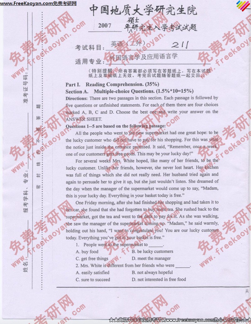 专业课考研经验 本站小编 FreeKaoyan 2018-01-23中国地质大学(武汉)2007年考研真题-英语语言文学基础