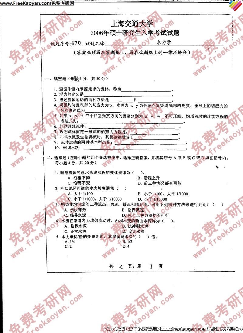 上海交通大学2006年考研真题-水力学
