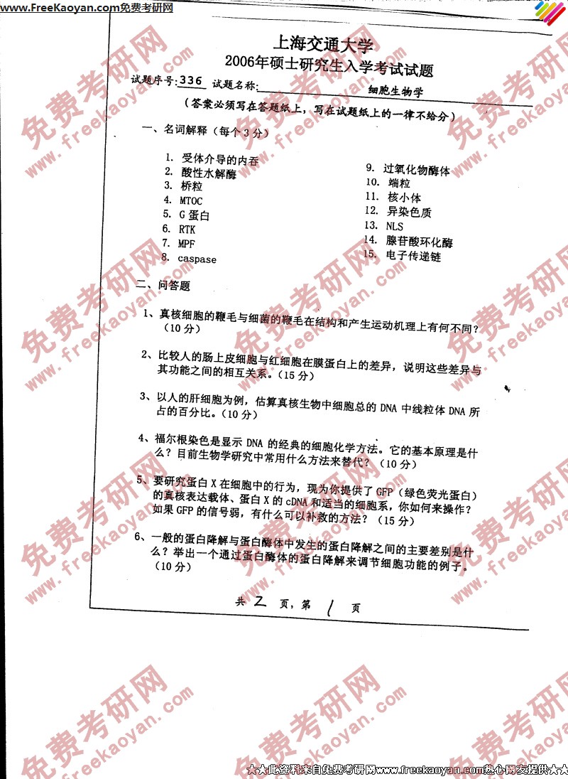 专业课考研经验 本站小编 FreeKaoyan 2018-01-23上海交通大学2006年考研真题-微生物学