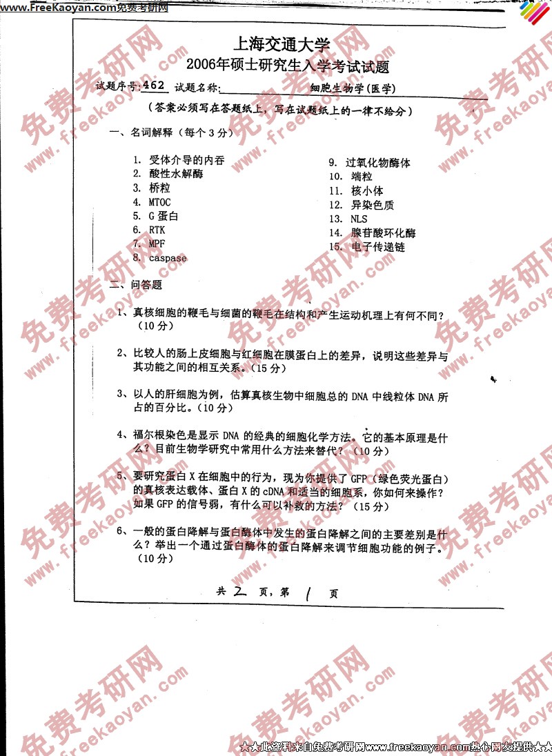 上海交通大学2006年考研真题-细胞生物学(医学)
