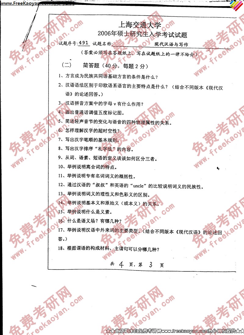 上海交通大学2006年考研真题-现代汉语与写作(3)